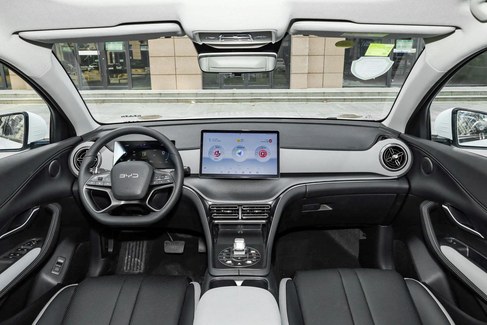The BYD Sea lion 05 DM interior features a "sea aesthetic" design concept with a classic combination of an all-LCD dashboard and a 15.6-inch rotating center screen with a water wave patterned panel underneath to accentuate the ocean style.