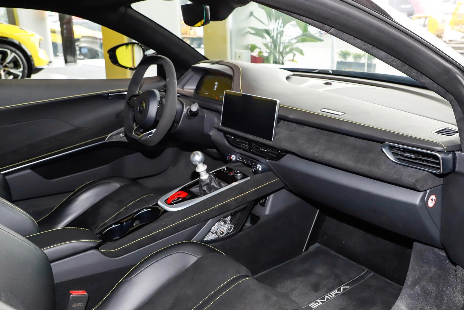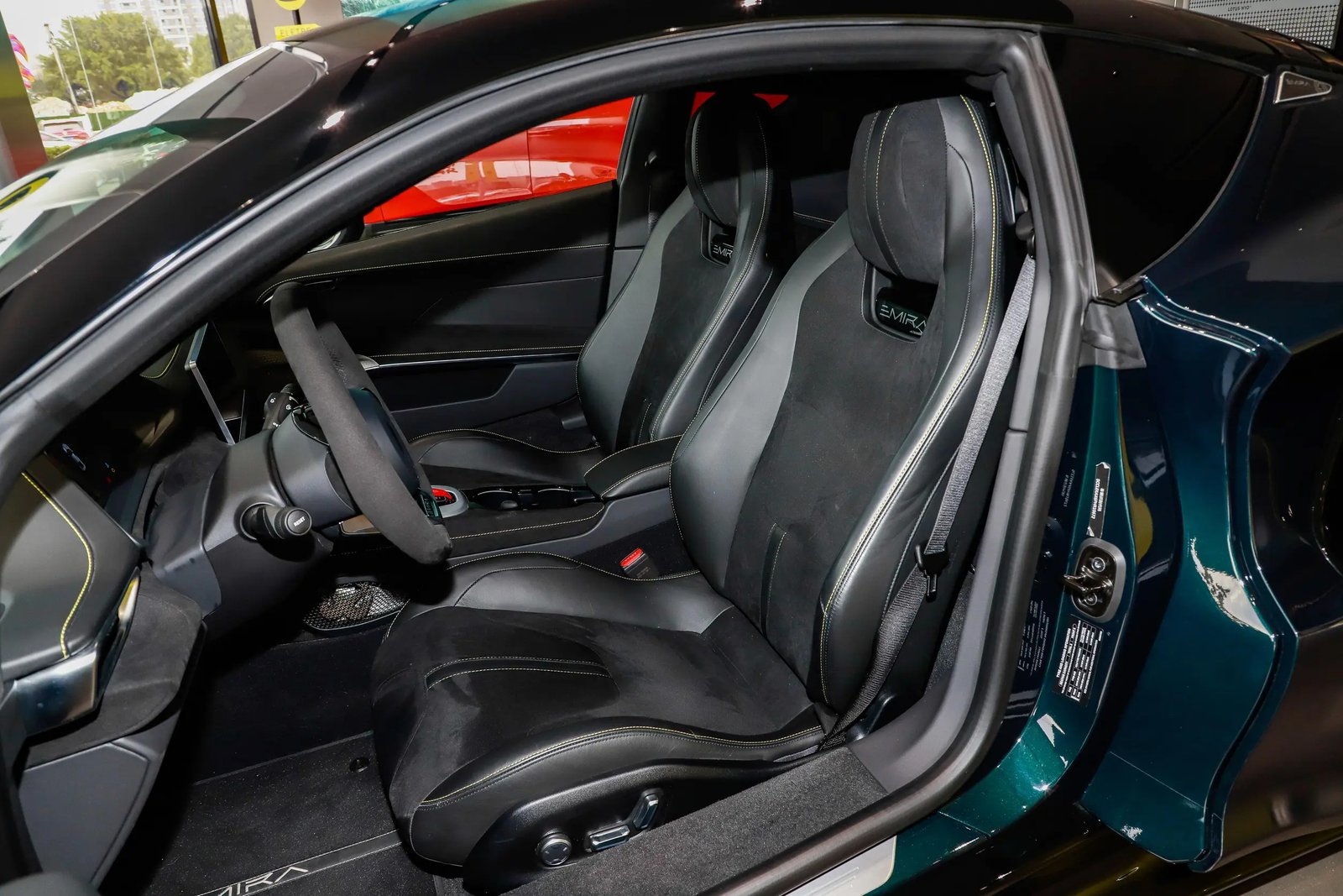 LOTUS Emira First Edition, a mid-mounted rear-drive sports car with a charismatic acceleration sound. The sultry, supercharged engine is hidden behind the cockpit, just a glass window away from you.